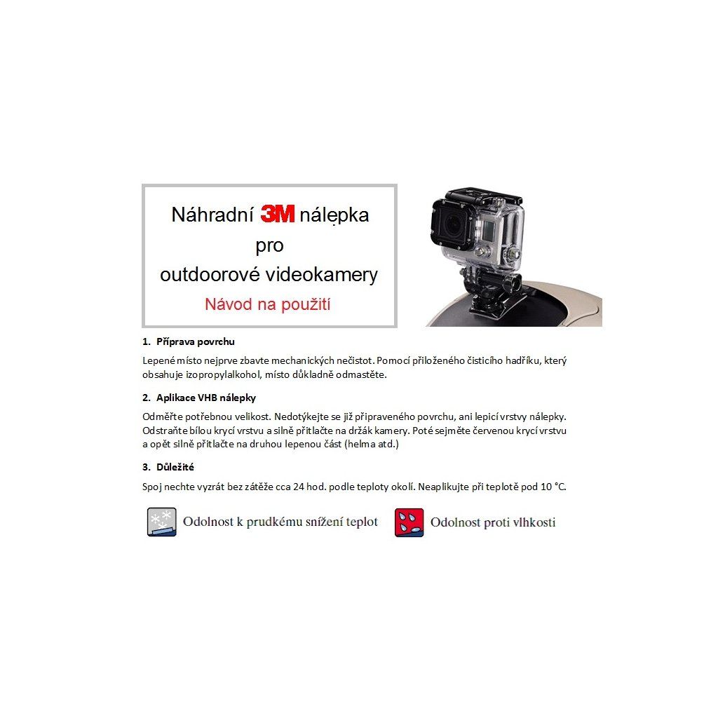 Oboustranně lepicí 3M nálepka slouží ke spolehlivému připevnění outdoorových kamer (GoPro, SJCAM, Rollei, Niceboy, … ) nejen k helmám, ale i kapotám, snowboardům apod. Vysokopevnostní pěnová nálepka výborně vyplňuje nerovnosti a tlumí vibrace (tloušťka 2,3mm). Odolává exteriérovým podmínkám, snáší extrémní teploty. Těsní a izoluje. Rychle a čistě vytváří dlouhodobě spolehlivé spoje. Měkká přizpůsobivá pěna dokonale přilne i k hrubým strukturovaným povrchům. Je odolná vůči migrujícím plastifikátorům (změkčovadlům) z měkčených plastů (PVC). Přiložený Čisticí ubrousek 3M VHB 1753 napuštěný isopropylalkoholem je určen pro čištění a odmaštění povrchu před lepením. Na lepeném povrchu jej předem otestujte.
